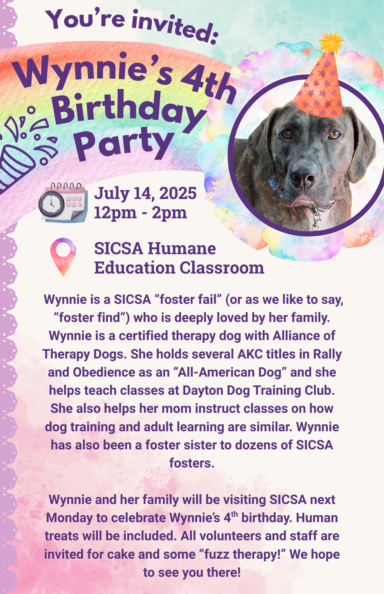 A staff and volunteer invite to a VIP* birthday celebration. I was responsible for the written content and design layout for this piece. This invite was part of a weekly staff e-bulletin, which I am responsible for managing. (*VIP = Very Important Pup)
