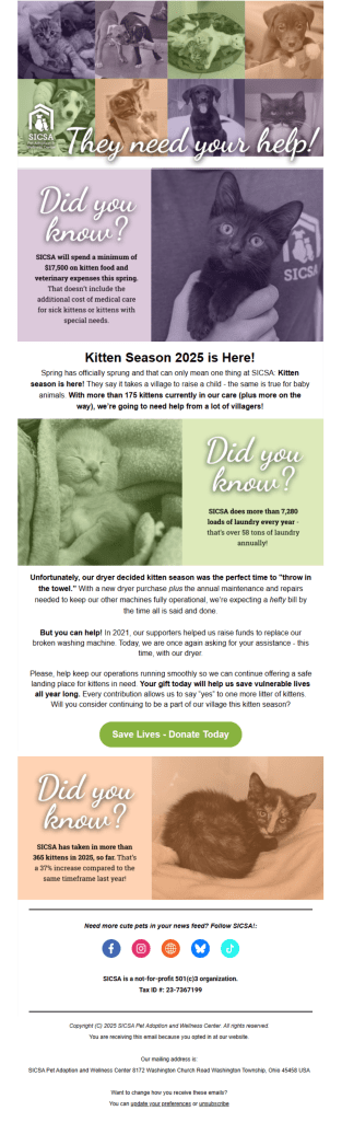 Per leadership’s request, the digital campaign was aimed at raising funds for the facility’s dying dryer. I used the “kitten season” messaging from the direct mail narrative to tie in the “Loads of Love” portion of the campaign. I created the infographics, wrote the copy, and sent out the email campaign independently (with approval from leadership).