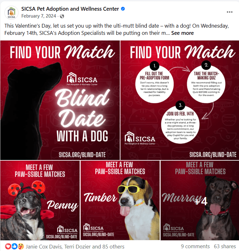 In February 2024, I planned a “Blind Date” event which would allow anyone to foster a dog for a Valentine’s Day “date.” The event was featured on a few local news segments and received a lot of positive engagement on social media and in person. We had twenty-four dogs ready to meet their match, eighteen people who filled out the blind date survey and pre-adoption applications . . . but on the day of the event, nobody showed up. It was a mid-week event during the shelter’s “slow season,” so we weren’t expecting crowds, but we thought we’d have at least a few takers (especially with the apparent excitement leading up to it).