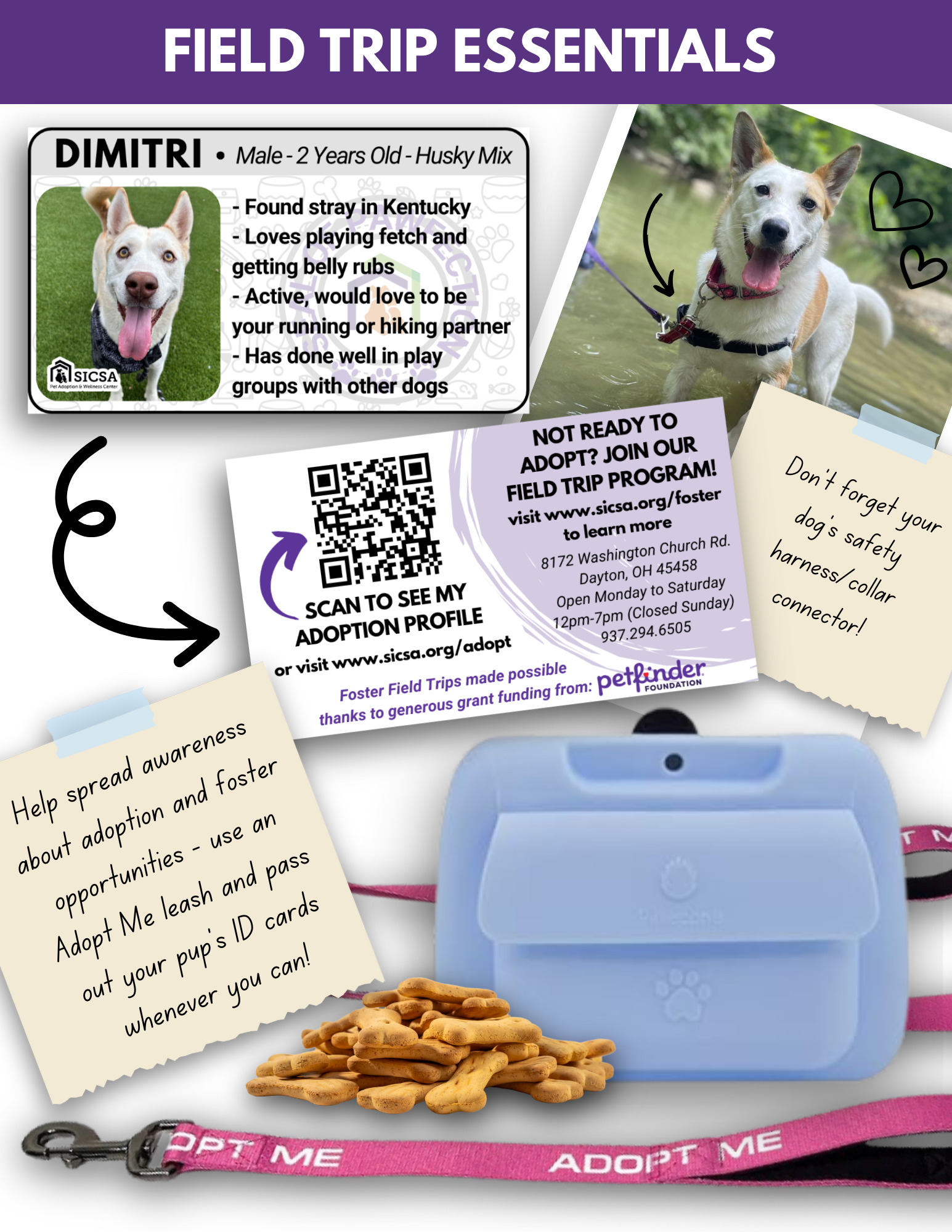 A sign for the volunteer board reminding volunteers to bring certain essentials when taking dogs on “field trips.” I was responsible for all written content and design layout for this piece. I was also responsible for designing and printing the “Dog ID Cards” as part of a grant agreement with Petfinder.